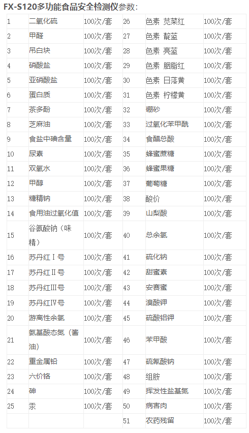 1、檢測(cè)項(xiàng)目:農(nóng)藥殘留、食用油酸價(jià)、過氧化值、甲醛、二氧化硫、吊白塊、亞硝酸鹽、面粉中鋁、蛋白質(zhì)、工業(yè)堿、雙氧水、硼砂、羅丹明B、過氧化苯甲酰. 糖精鈉。蘇丹紅(Ⅰ號(hào)、Ⅱ號(hào)、Ⅲ號(hào)、Ⅳ號(hào))等擴(kuò)充檢測(cè)項(xiàng)目50多種。