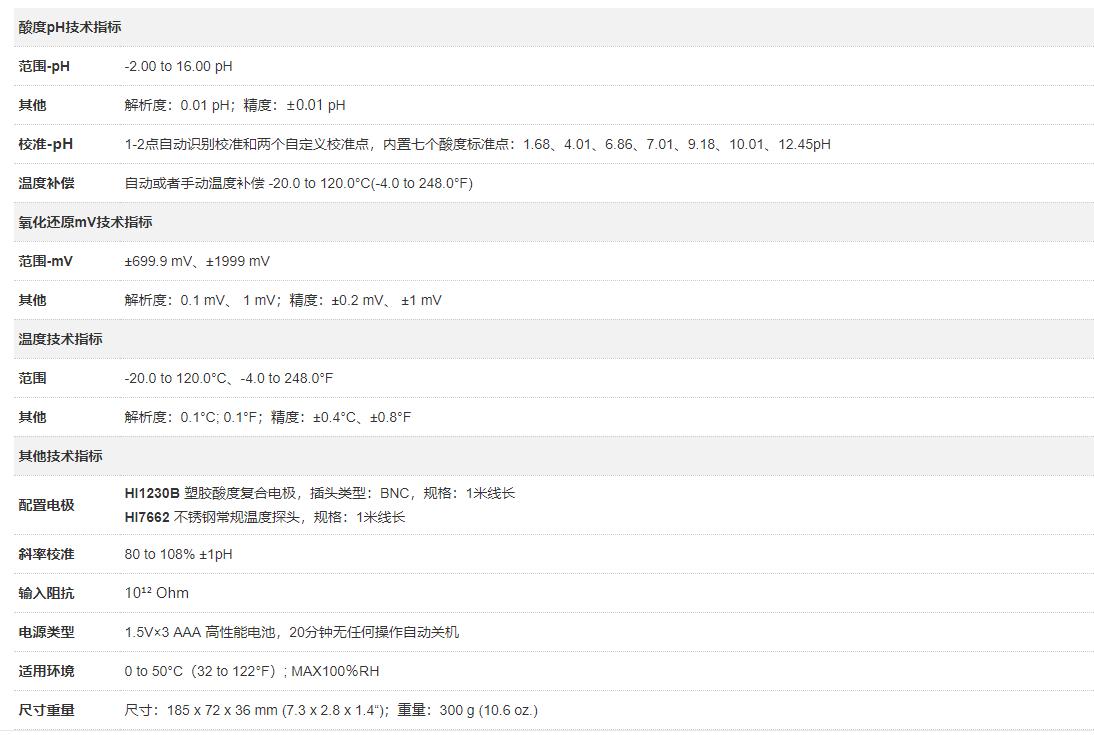 HI9126主機(jī),HI1230B 塑膠復(fù)合酸度電極,HI7662 不銹鋼溫度探頭,酸度標(biāo)準(zhǔn)緩沖液套裝(標(biāo)準(zhǔn)值@25°C:4.01pH、7.01 pH 和常規(guī)電極清洗液,規(guī)格:20mL,袋裝),HI740036P 塑料刻度燒杯(100mL、1個(gè)),中英文使用說(shuō)明書(shū),HI721046 定制專(zhuān)用攜帶箱。