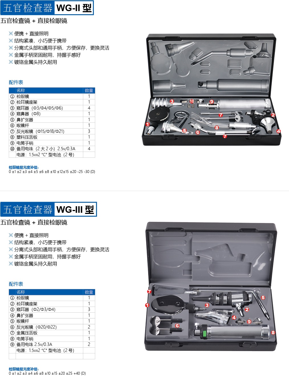 由檢眼鏡、檢耳鏡、檢鼻器、喉鏡組、壓舌器、金屬電筒手柄組成。