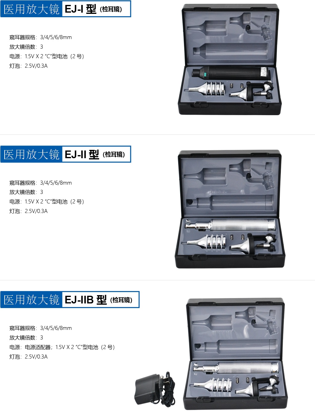 ●檢耳鏡 配有多個(gè)不同孔徑的窺耳器,能方便換接于檢耳鏡座架上,適用于耳道大小的需要。 均配有照明光源和3 倍放大鏡。照明光軸與放大鏡軸接近重合。適宜深部檢查。 ●窺耳器規(guī)格:3,4,5,6,8毫米 ●放大鏡倍數(shù):3 ●電源:1.5VX2 “C”型電池(2號(hào)) ●燈泡:2.5V/0.3A